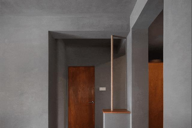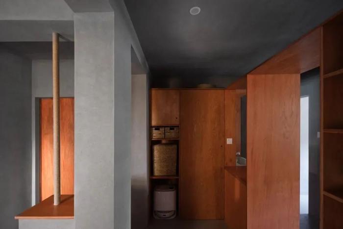 在这个家里,过道上的矮墙和猫爬架形成新的“几何构成关系”,通过这组构成,家显得更有层次。