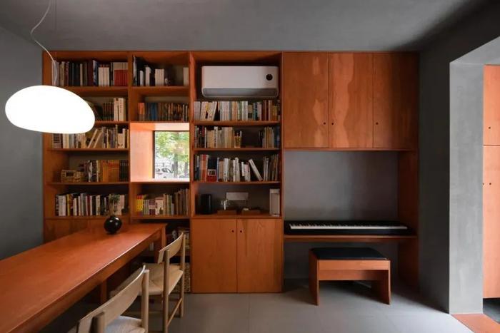 客餐厅区,窗洞像一个框景。书柜等都是设计好后,师傅现场制作的。吴状夫妇在施工过程中利用钢结构做了很多二次加固的措施