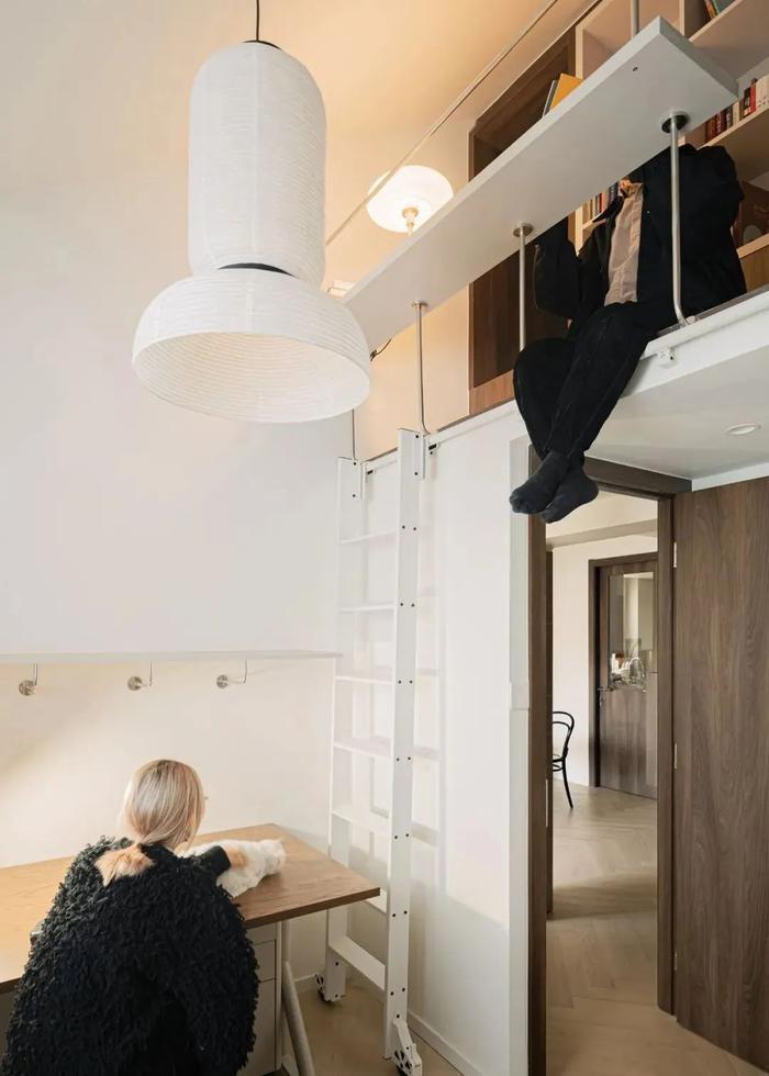 上下层书架足够承载夫妻俩的藏书需求。带轮子的爬梯平日可收纳在墙边,不影响底层通行。跨层取书时,通过爬梯上下,也为阅读增添了仪式感。