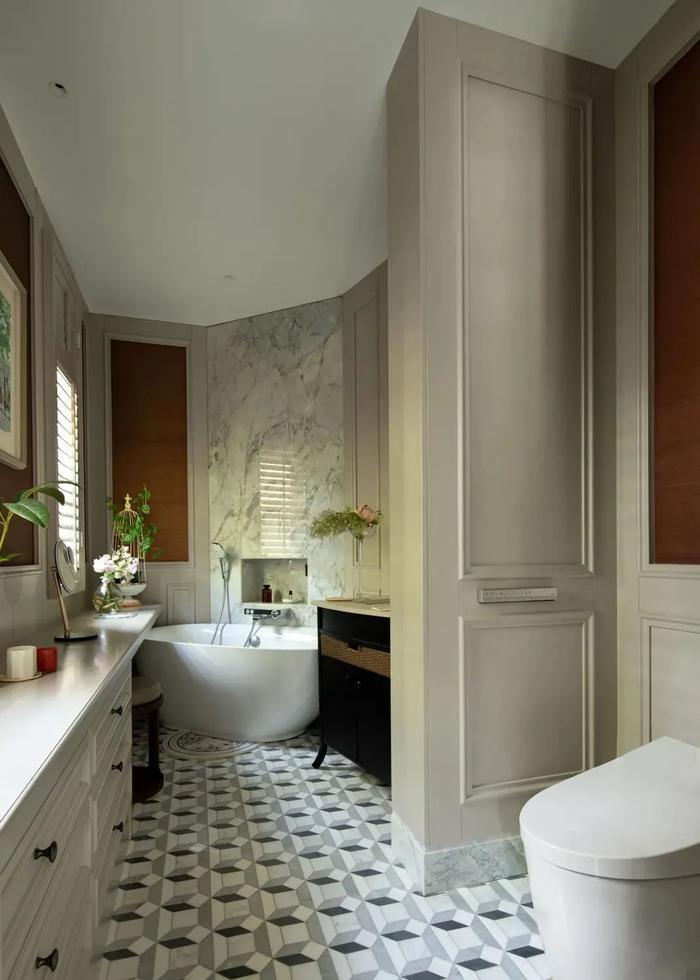 地砖沿用雅灰与素白的马赛克造型,这种拼贴手法充满岁月感。