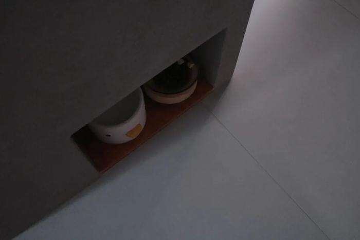 楼梯下方放置餐桌,餐边柜台面延伸到楼梯一侧,形成踏步。低处的踏步,成为摆放猫窝和喂食器的置物架。