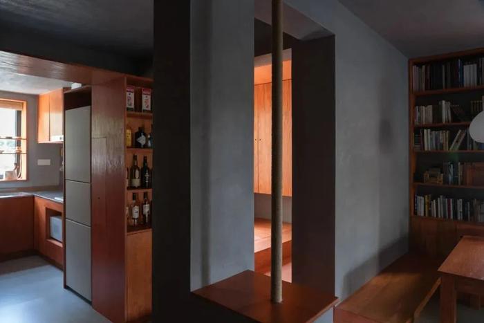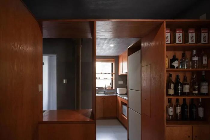 于是他们决定,在多功能区置入一个“Z字型”装置,这个装置就像集合了mini吧台、酒柜、厨房、家政间等等的大家具,不仅分隔、组织了生活空间,其内部大大小小的窗洞、门洞也使整个家更通透,同时又争取到了更多的收纳区域。