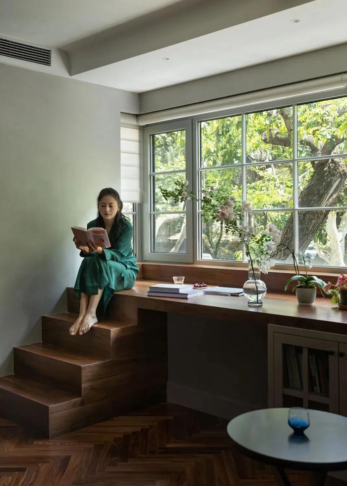 设计师只好将窗台稍稍拓宽,并将细碎的楼梯改造成4个大台阶,用实木包裹。台阶下方空间充分利用,藏一个小书架,搬张椅子摆上美酒佳肴,就变成了一个吧台。