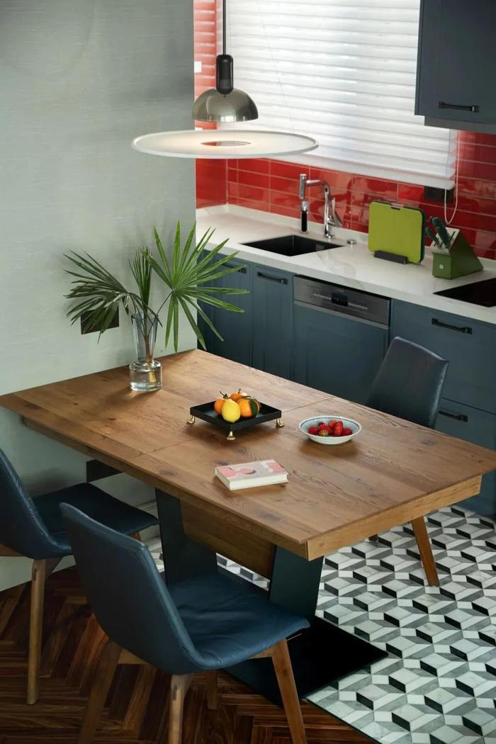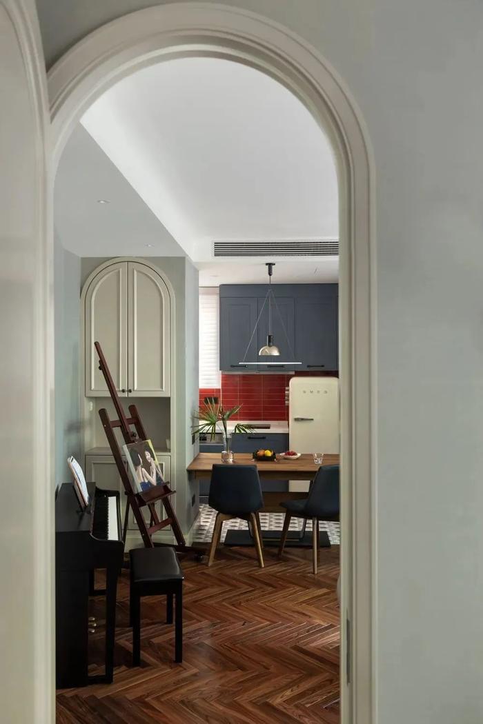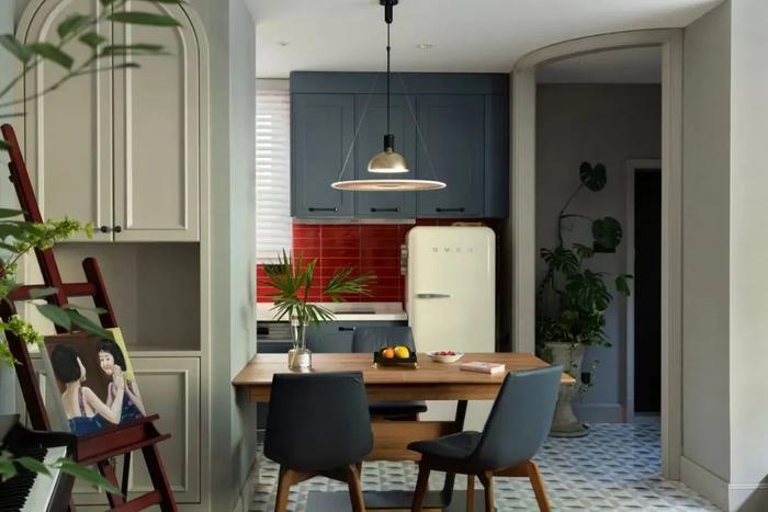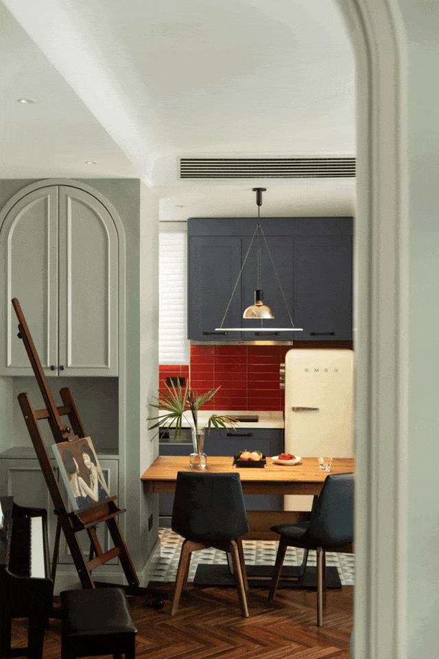 再往里走是厨房,这儿光线不好,便做成开放式设计,引光入室。设计师用深蓝色柜体和鲜红色墙砖进行鲜明对比,营造热情、奔放的氛围,加强心理暗示。
