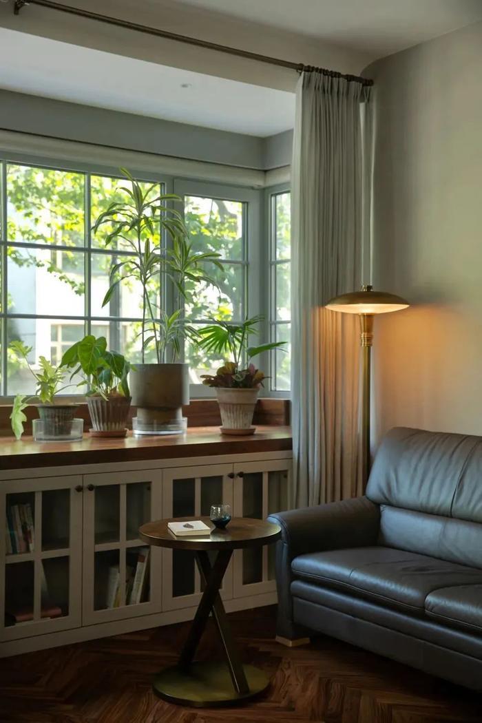 客厅低饱和度的色彩奠定了温润清透的调性,最难得的是有一个外扩的窗台,黄澜可以透过老上海的古旧格子钢窗,观察这座城市里的鲜活景观。