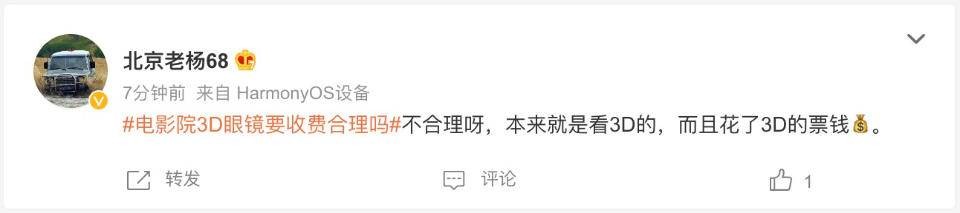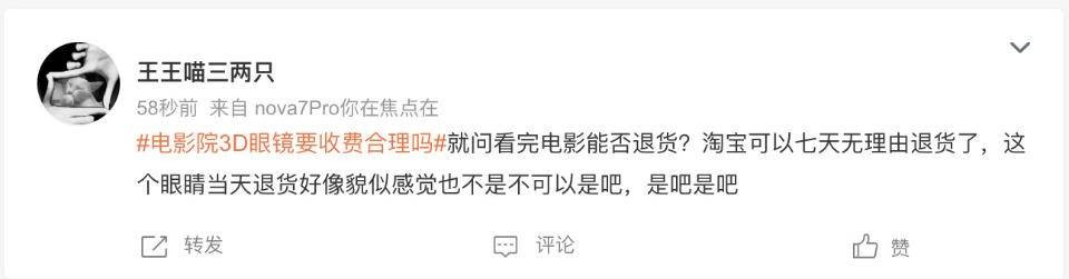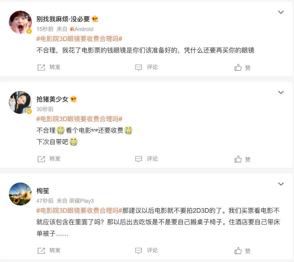 也有少数网友表示,当地的电影院一直不收取3D眼镜的费用,并不知情类似条款。