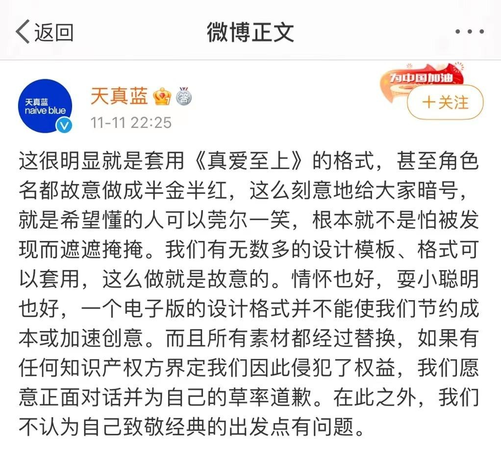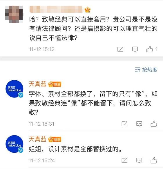 11月11日晚,天真蓝官方在微博单独发文声称自己就是“直接套用”,并且“不怕被发现”,强调自己是“故意”将海报做成一模一样。