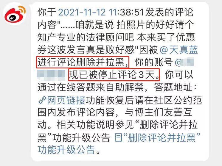 但是,与其在微博上发文的“大方回应”相反,天真蓝却在一天之内拉黑了在评论区表示“套用模板创意是侵权违法”言论的用户数名。