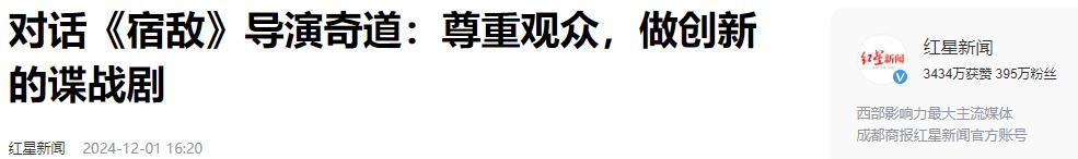 信息来源:《红星新闻》在2024年12月1日发布关于“对话《宿敌》导演奇道:尊重观众,做创新的谍战剧”的报道