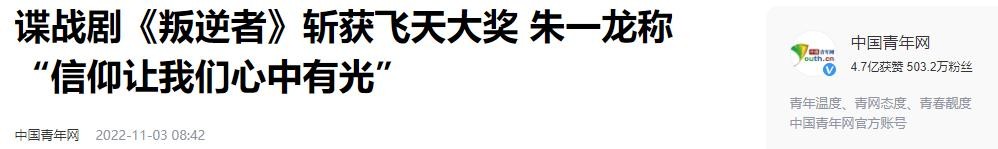 《中国青年网》在2022年11月3日发布关于“谍战剧《叛逆者》斩获飞天大奖 朱一龙称“信仰让我们心中有光””的报道