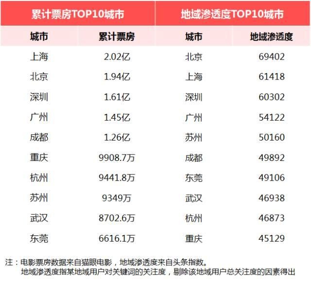 通过今日头条发布的大数据也可以看到,《战狼2》累计票房的TOP10城市,与头条指数里的地域渗透度最高的TOP10城市高度重合,大多集中在长三角和珠三角。长三角和珠三角遍布《战狼2》的真爱粉。