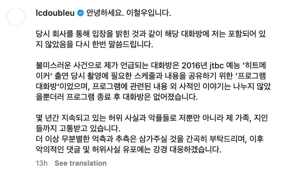 Burning Sun事件爆发后,娱乐圈的阴影逐渐扩大,李哲宇的名字也不幸被卷入其中。一时间,各种猜测、指责和谩骂铺天盖地而来,让他陷入了前所未有的困境。但面对这一切,李哲宇没有选择沉默,而是勇敢地站出来,为自己辩护。