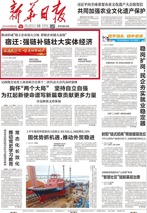 今天(7月19日),《新华日报》在头版头条,以《推动形成“链主企业顶天立地 群链企业铺天盖地” 宿迁:强链补链壮大实体经济》为题,推出关注宿迁的报道。全文如下: