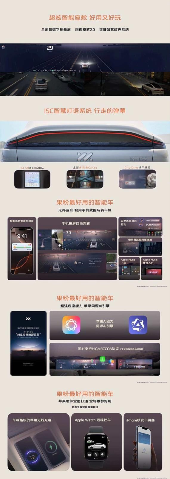 在智能化体验上,搭载基于英伟达Orin X的智能驾驶辅助超算中枢(IPD),提供1个超远距高精度激光雷达、12个超声波雷达、11个高清感知摄像头、3个毫米波雷达、2个高精度定位单元。值得一提的是,该车将配备雨夜模式2.0,该功能能够全屏显示路况、自动识别水坑,提升雨天行车安全系数。同时,拥有City Drive城市漫行、全新多视角Carlog、IM GO组队出行等体验;ISC智慧灯语系统也适当增加车辆的娱乐性。未来将实现ETC收费站自主通行等高难度场景,年内还计划实现“车位到车位”的自主通行功能。智舱方面,智己与阿里旗下斑马智行合作共建“AI生态座舱”,基于苹果同源AI引擎,将带来更多新奇AI体验,还将深度融合DeepSeek大模型,实现500余项功能和体验优化,包括自定义语音唤醒词、方言语音等,为用户提供更智能、个性化的出行服务。