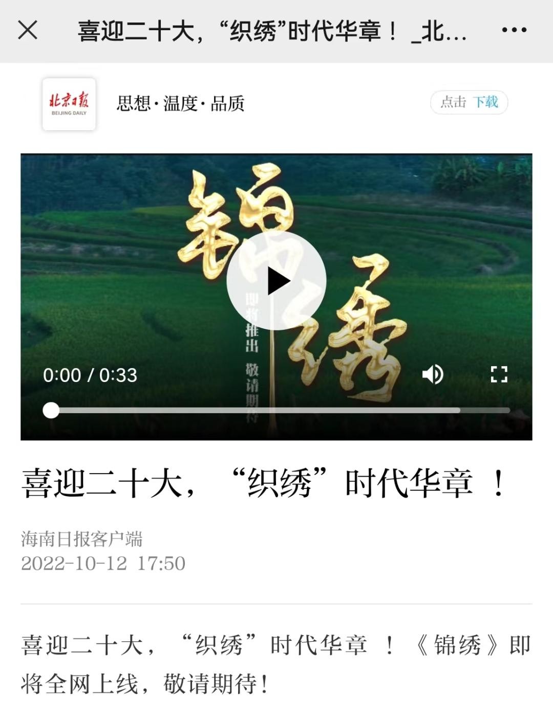 值得一提的是,本次《锦绣》预告片还获得了包括南方+APP、北京日报APP、新湖南客户端、浙江新闻客户端、川观新闻、江西新闻等近20家主流媒体转载支持,形成多方联动效应,营造出热烈的喜迎党的二十大氛围。