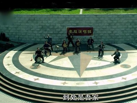 影片中间,老杨头带着布鲁克斯去染头发,中间路过一个圆形广场,一群由老年人组成的老腔演唱班在台上唱着秦腔,周围除了老杨头和布鲁克斯以外,只有几个人在听。
