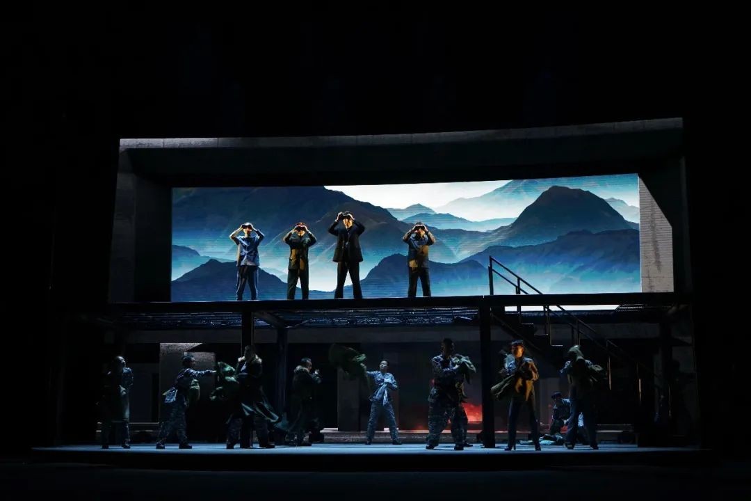作为一部展现军工科技图景的作品,《红箭 红箭》在舞台呈现方面大胆突破。舞台结构是高度提炼过的、富有象征意味的空间语汇,而不是深山密林里的几间水泥房子。舞美风格采用了结构性的语言,在不同场景的氛围和质感营造上运用多媒体设计和灯光设计结合空间赋予舞台生动、饱满的视觉形象。