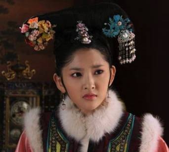 眉毛描得不算很黑,眉尾收得太早,眼神显得傲气,不得不佩服《甄嬛传》的化妆团队~