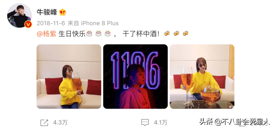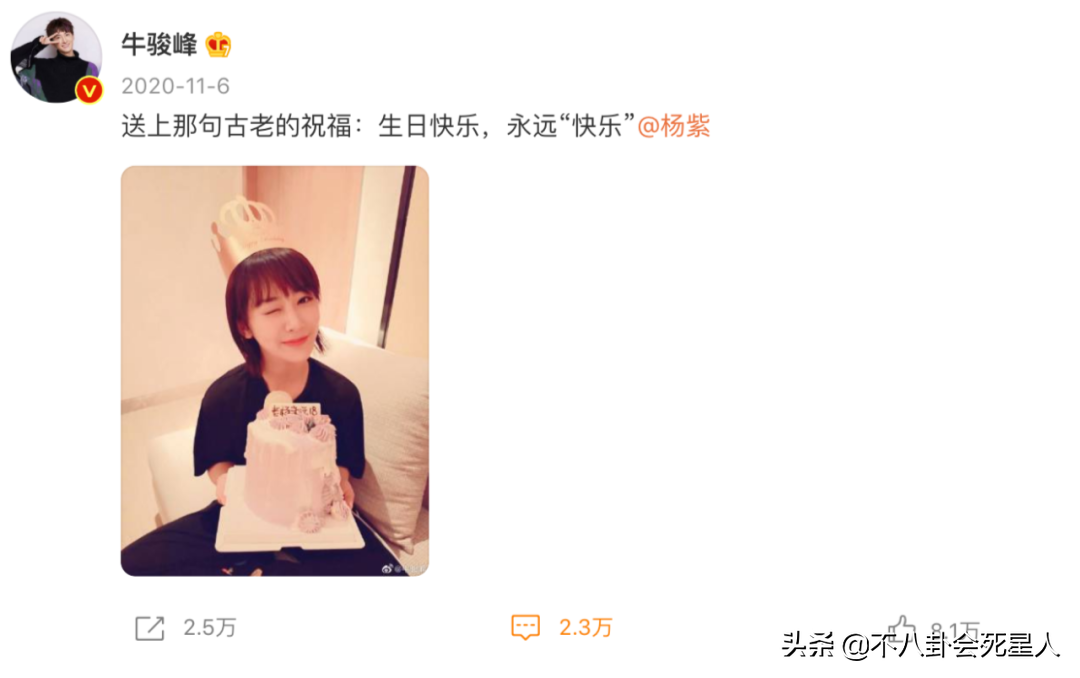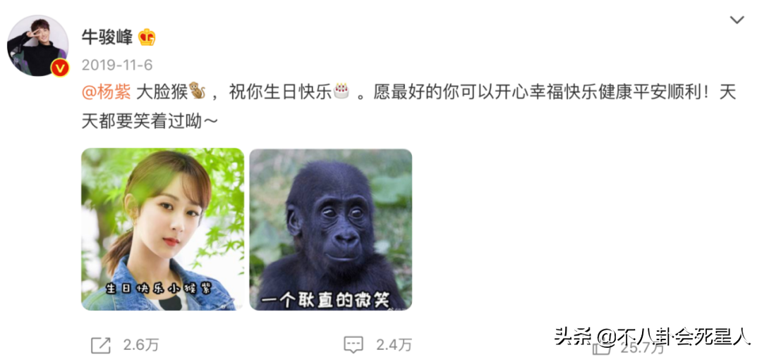 牛骏峰从2018年开始,每年都为杨紫庆生,还给她起外号,叫她“大脸猴”。