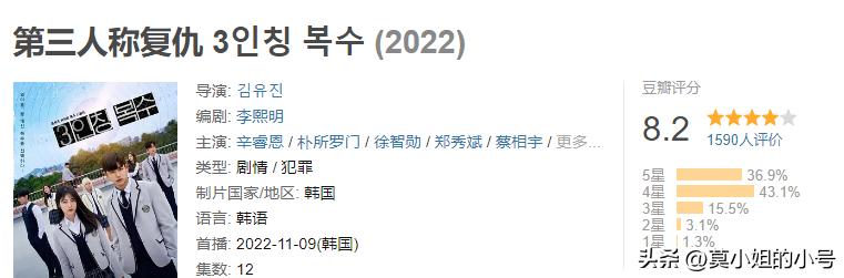 《第三人称复仇》讲述一个复仇故事,背景被设定在校园内,本该是天真善良的学生变成双手沾满鲜血的恶魔。开播后,收获了良好的口碑,豆瓣分数为8.2分。