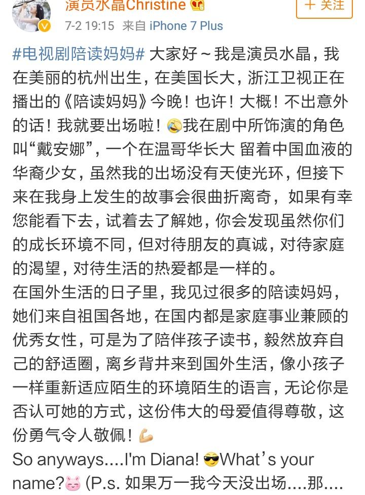 水晶发帖说,在国外见过很多陪读妈妈,毅然放弃了在国内的舒适区,离开家乡出国生活。像孩子一样重新适应陌生的环境和语言,无论你否认她的方式,这种伟大的母爱都值得尊重,这种勇气也值得钦佩!?