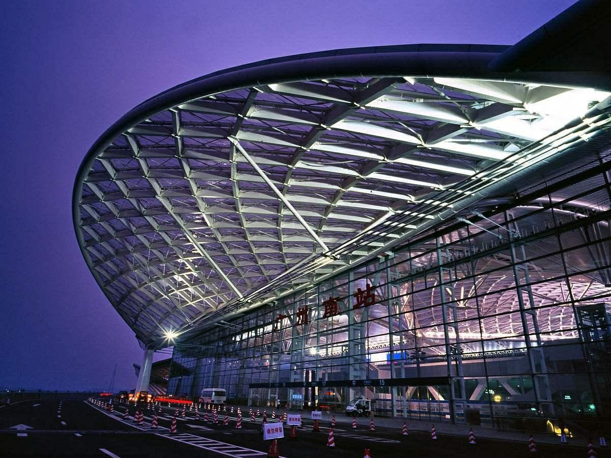 车站设计和建设充分尊重广州山水城市的格局,做到自然环境与人工环境融为一体。巨大的玻璃穹顶棚形似6片漂浮于空中的芭蕉叶,站房屋顶以一片片的芭蕉叶为基本单元,通过中央采光带的串联,形成极具特色的建筑形态。