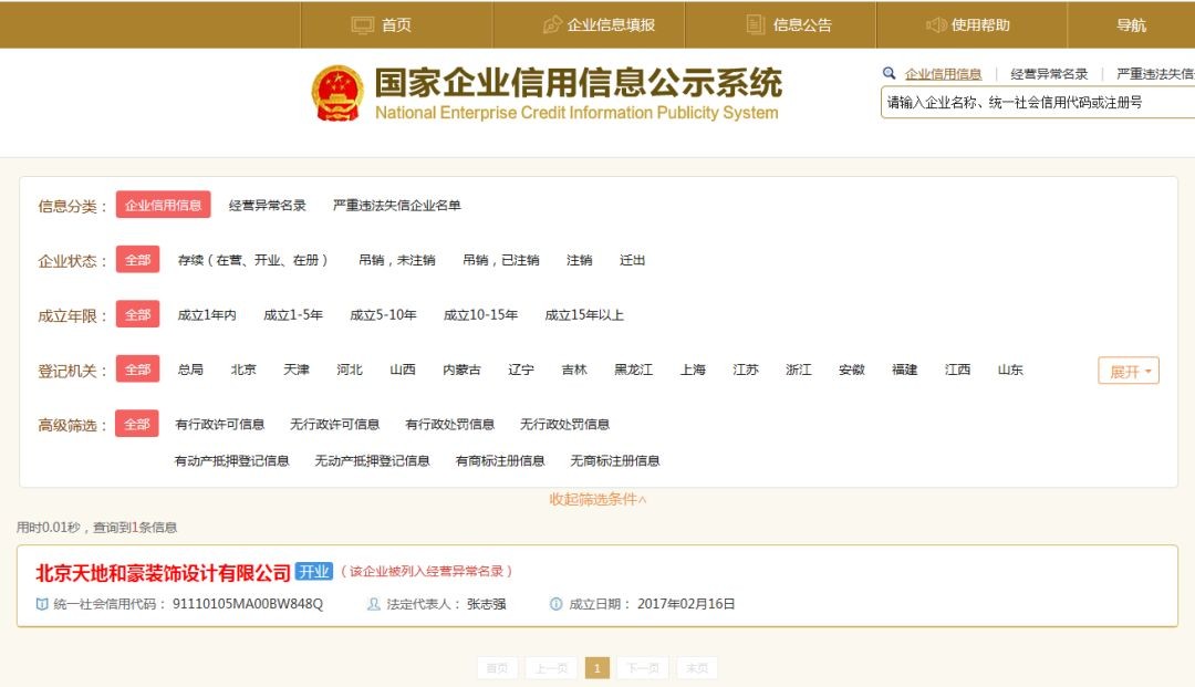记者注意到,北京天地和豪装饰设计有限公司已被列入经营异常名录。2019年6月10日,北京市工商行政管理局朝阳分局因通过登记的住所或者经营场所无法联系将其列入经营异常名录。8月11日,又因同样的原因被昌平分局列入经营异常名录。