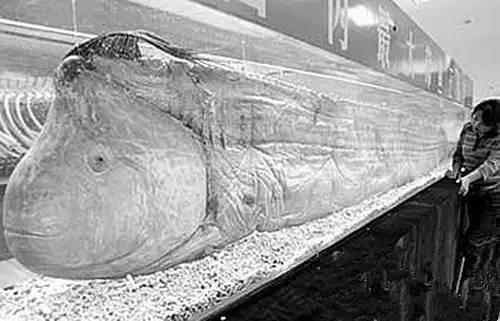 下图为福建自然博物馆的一条长达4.65米、宽0.5米、重88公斤的巨型带鱼标本。据介绍,该带鱼是两年前福建长乐梅花镇码头的渔民在深海捕鱼时意外捕获的,后将其献给福建省海洋局而制成标本科研并供人观赏。据鱼类专家按其骨龄分析,这条“带鱼王”年龄在百岁以上,如此巨大的带鱼目前在国内尚属首次发现。