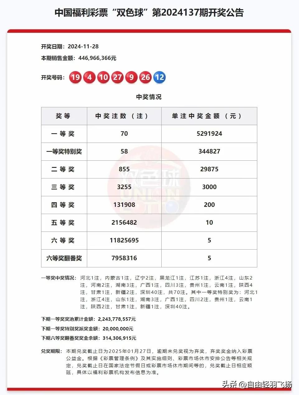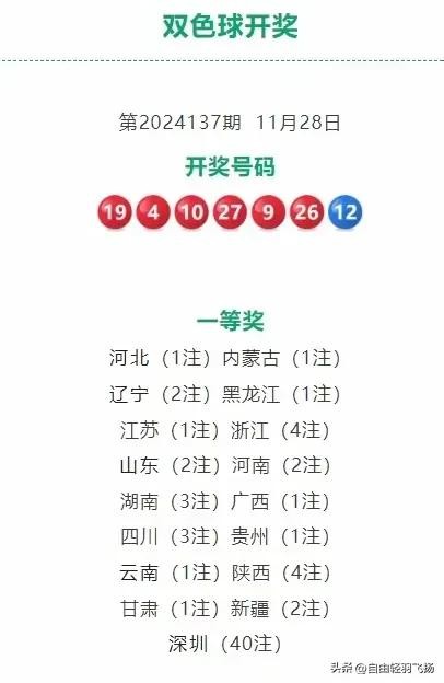 1月28日,福彩双色球第24137期开奖,同时本期还是双色球12亿大派奖的第12期开奖,开奖号码为红球04 09 10 19 26 27,蓝球12。