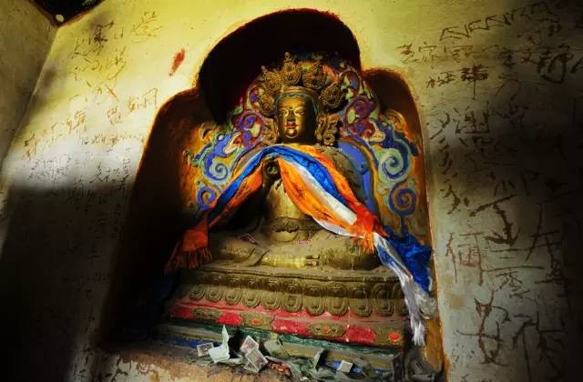 三十三天洞是马蹄寺石窟群的艺术典范,佛像造型生动,神态乱真。有的似在说法,手指有示,眉眼生动;有的似在修炼,手结契印,目如垂帘;有的似在悟道,若有所思,若有所得。在这高接云天的石窟,香火却来得出乎想象的旺盛。在每座佛像前的香案上,都有成盒的檀香供人取用。这是僧人理解游人攀登之不易,故而特设的。大凡游人一片虔诚,艰难地攀越来此,自然逢佛进香,见佛必拜,求平安,祷健康。求完拜完,往功德箱塞些钱,表表心意,算是香钱,亦叫随喜功德。