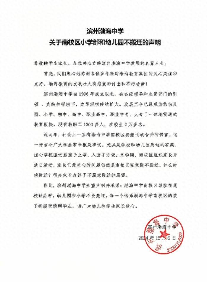声明中,滨州渤海中学表示,渤海中学南校区将继续在现校址办学,幼儿园和小学不会搬迁。每一个选择渤海中学南校区的孩子都能就读到毕业,请广大幼儿和学生家长放心。