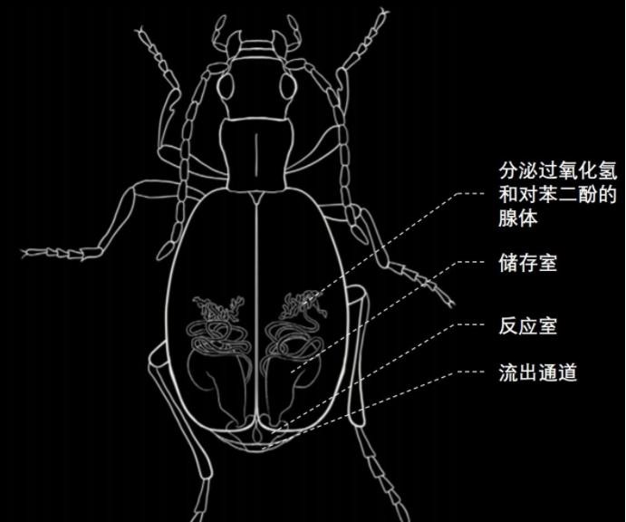 在喷射毒液时,它们的身体发生着奇妙的化学反应。毒液并不是像毒蛇一样随随便便喷射,而是经过精密的设计进行的。射炮步甲发射的毒液是醌类物质。在它的体内毒液会和另外一个地方储存的过氧化氢发生反应,两者接触后就会产生激烈的化学反应。