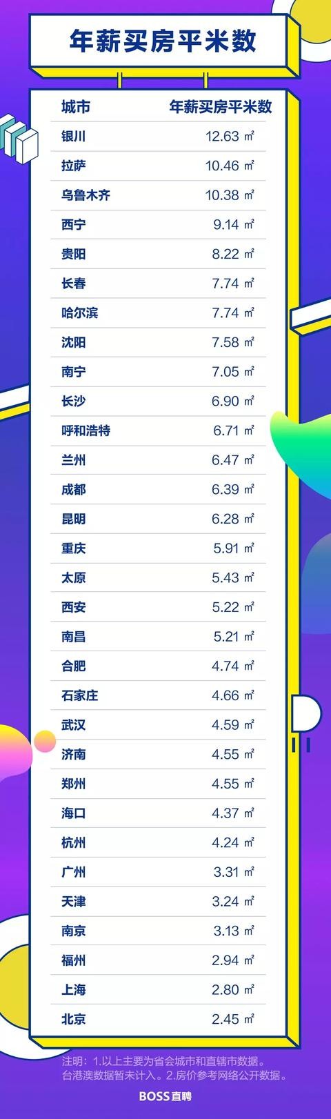 你看,单纯以此衡量生活压力指数,银川年轻人的压力最小,平均一年薪水可以买房12.63平米,当然,如果银川年轻人在北京工作,赚北京的工资,买家乡的房子,可能幸福指数会更高。