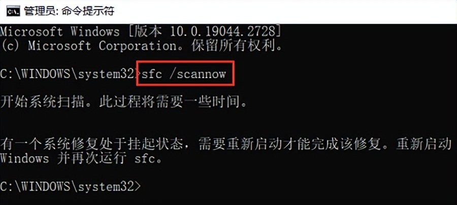 步骤2:输入【sfc /scannow】命令,并按回车键。
