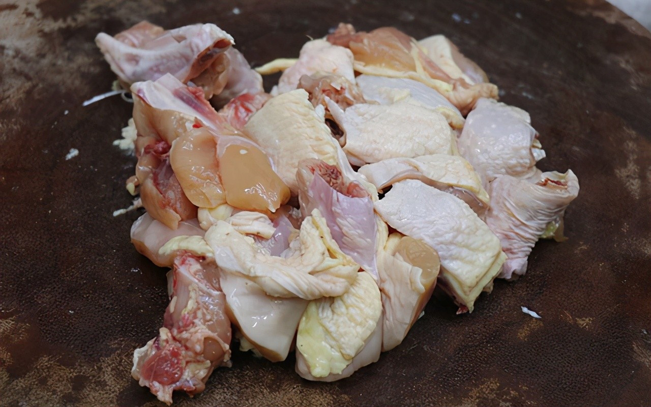 第四步:把鸡肉清洗干净并剁成大块,接着加入清水多清洗几遍,洗去里面的血水,洗好后捞起来挤干水分备用。