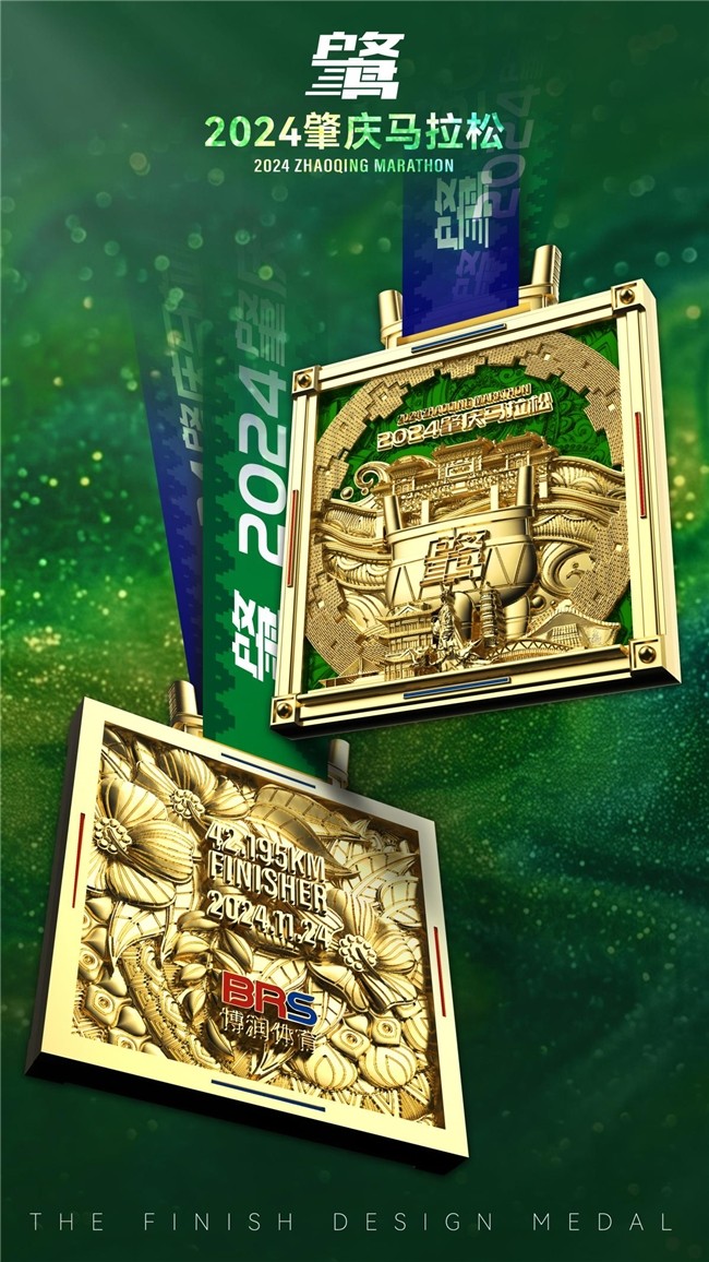 马拉松、半程马拉松、欢乐跑均设有了奖牌,设计融入了肇庆古城墙、七星岩奇峰、鼎湖山九龙宝鼎等城市特色元素。