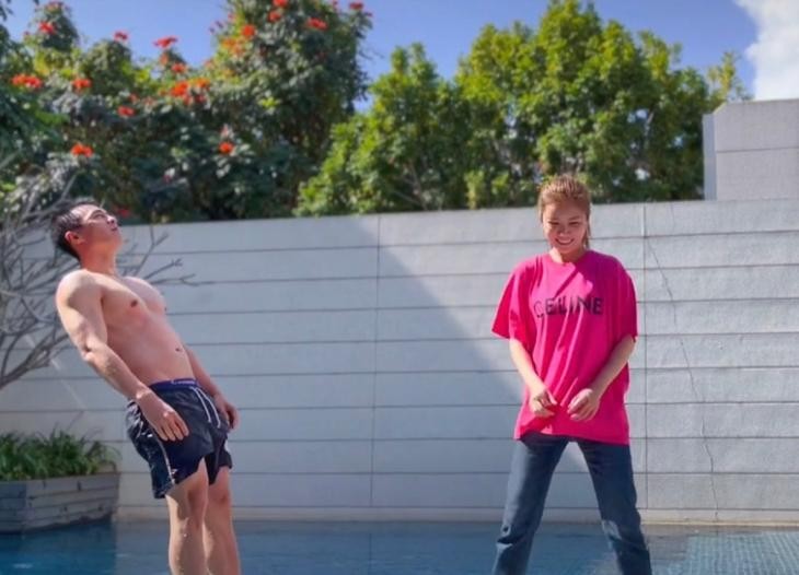 杜淳穿着泳裤,王灿则是穿着宽松的玫红色短袖,搭配长款牛仔裤。杜淳的身材好似年轻小伙一般,身材保持得相当好,腹肌十分明显。