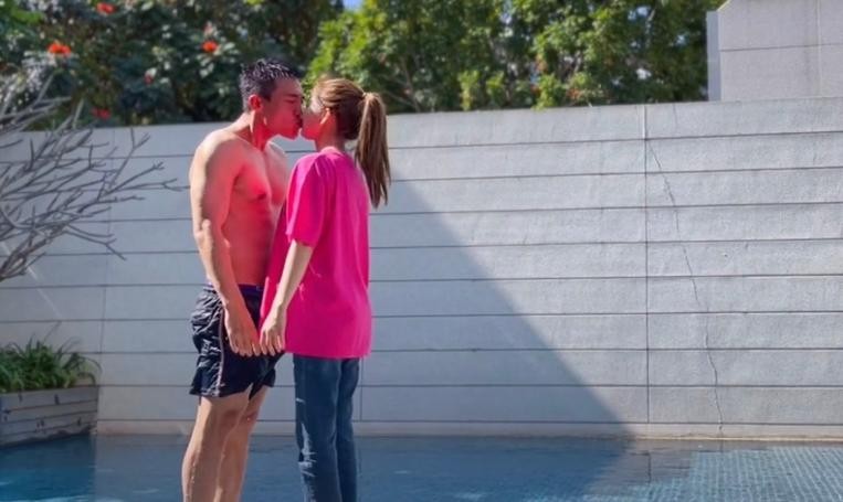 1月22日,杜淳在社交平台上更新一则视频,与娇妻王灿一起诠释“坠入爱河”,两人在泳池边亲吻,配文称倒下水后背拍太疼了,高调地秀恩爱,羡煞旁人。