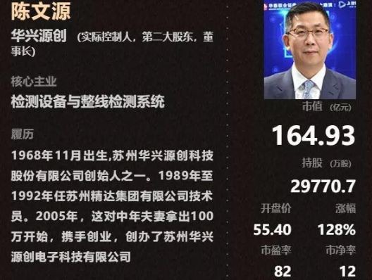 按照今天中午收盘价计算,科创板编号第一股华兴源创实际控制人陈文源、张茜夫妻持股市值208.74亿元,较开盘前上涨127.19亿元,仍然稳坐科创板首富地位。