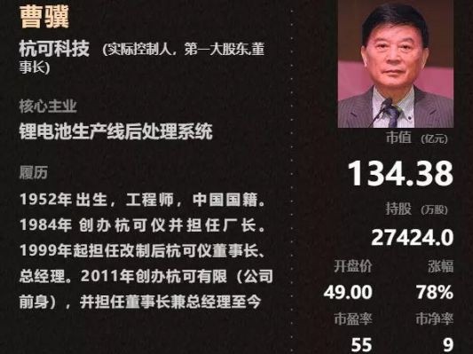 杭可科技实控人曹骥、曹政父子直接或间接控制公司约为80%的股份,以中午收盘市值243亿元计算,父子身家188.62亿元排名第二。