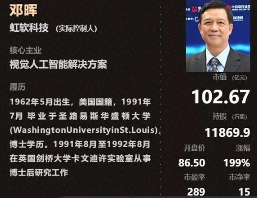 虹软科技一直致力于视觉人工智能,实际控制人为美国国籍Hui Deng(邓晖)及 Liuhong Yang,合计持有发行前38.7527%的股份,发行后稀释为34.362%,按照发行价,持股市值达到39.94亿元。