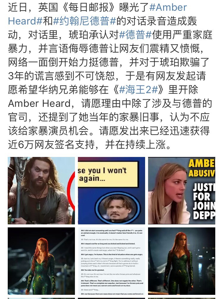 现在口碑大反转,事实上是德普被家暴,还被拿烟头烫脸,众多网友请愿《海王2》能开除Amber,网友签名支持已经超过了6万,并且数量还在不断增加。