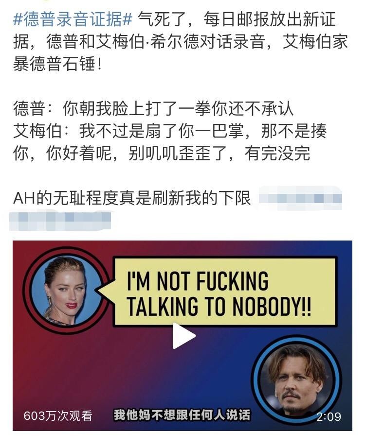 2月1日,英国媒体曝光了一段德普与前妻Amber的对话录音,时长约50分钟,在对话中,两人发生了争吵,一开始Amber并不承认家暴德普,称自己只是打了他一下,并没有痛扁他。