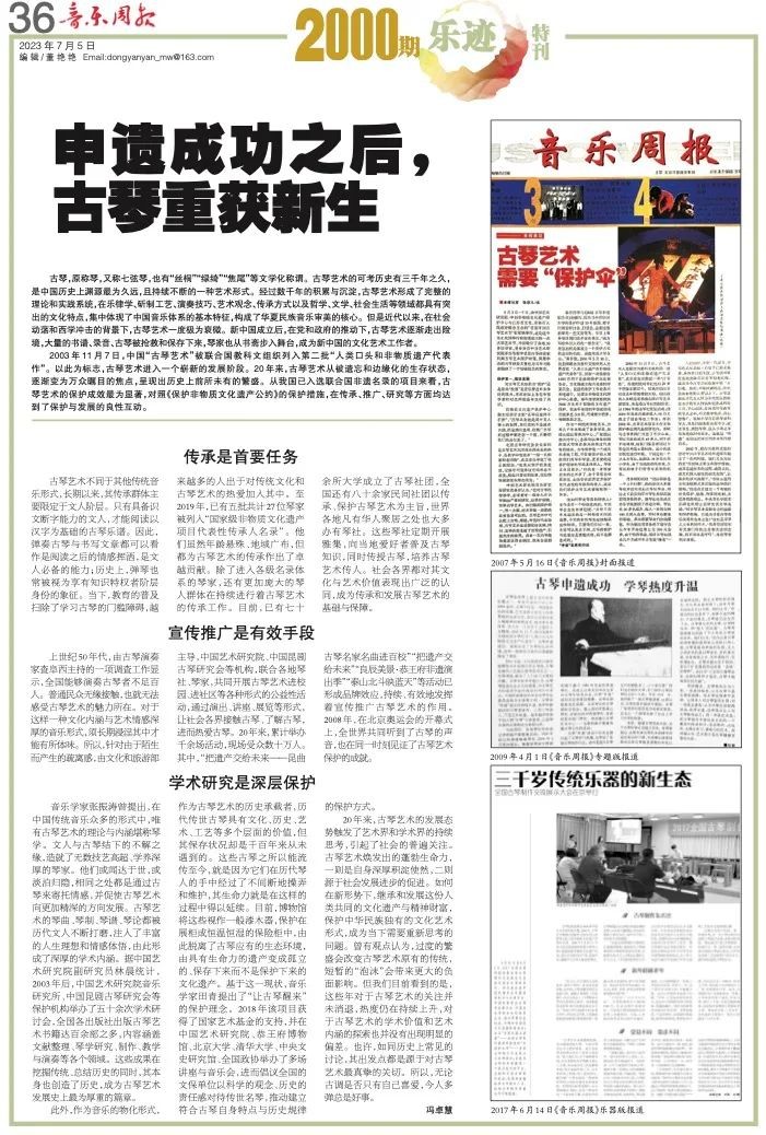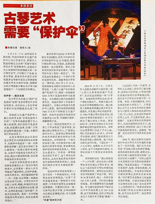2003年11月7日,中国“古琴艺术”被联合国教科文组织列入第二批“人类口头和非物质遗产代表作”。以此为标志,古琴艺术进入一个崭新的发展阶段。20年来,古琴艺术从被遗忘和边缘化的生存状态,逐渐变为万众瞩目的焦点,呈现出历史上前所未有的繁盛。从我国已入选联合国非遗名录的项目来看,古琴艺术的保护成效最为显著,对照《保护非物质文化遗产公约》的保护措施,在传承、推广、研究等方面均达到了保护与发展的良性互动。