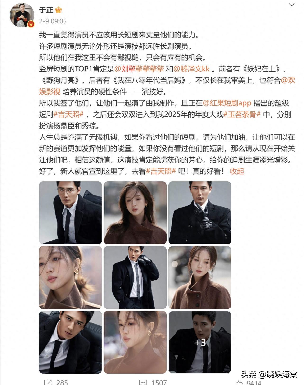 短剧演员滕泽文、刘擎被于正签下,马秋元杀进长剧圈,赵柯淳更是直奔综艺咖。