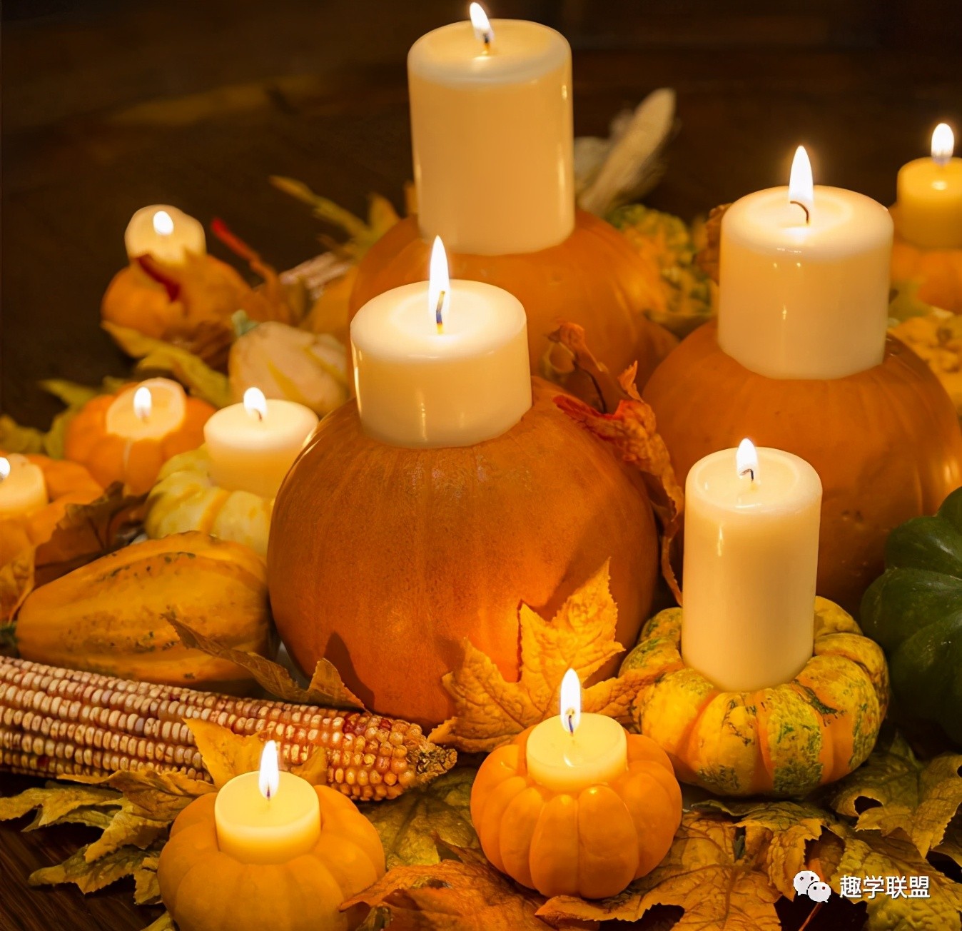置餐桌:感恩节餐桌的布置也很有特色。通常,人们会在餐桌上放上一个大南瓜,周围堆放些苹果、玉米和干果。有时还会把苹果或南瓜掏空,中间放满去壳的干果或者点燃蜡烛。人们边吃边愉快地回忆往事,直到最后一根蜡烛燃尽。