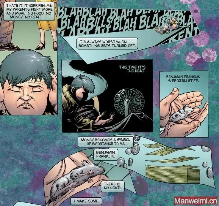 与此同时,由于贫穷和肥胖,没有吸引力的“胖子”小威尔逊经常在学校而受到同龄人的欺负和讨厌。更可悲的是,在一家人仍在为钱而苦苦挣扎时,因为欠费使他们家有一天没有了暖气,结果小威尔逊的宠物鼠“本杰明·富兰克林(Benjamin Franklin)”被冻死了,这也导致其产生了赚钱的欲望,并想为自己赚钱。