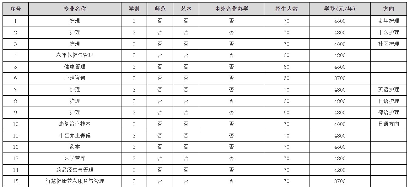 河南护理职业学院2023年单招的专业有15个,大多数涵盖了医药卫生类的普通专业。
