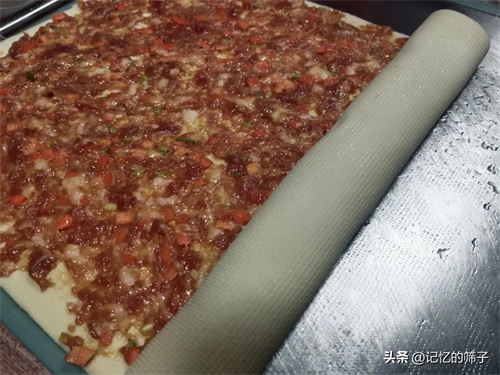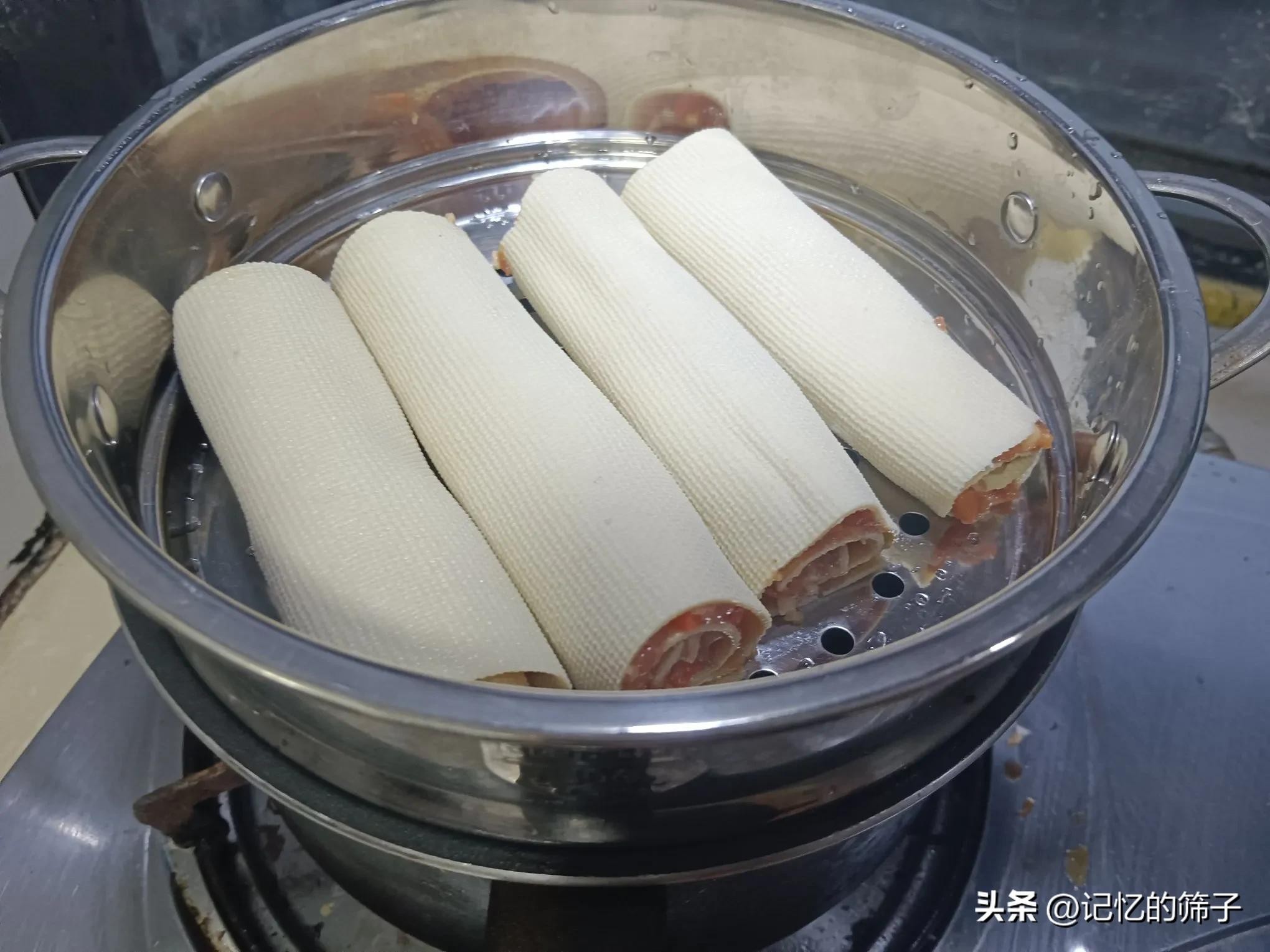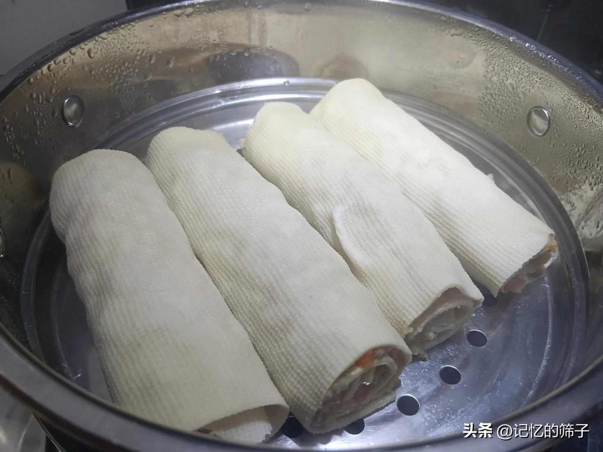 豆皮铺开,调好的肉馅在上边铺开铺匀,然后卷起来,我是一张豆皮最终分成了四个小卷。因为只有一个小小的带蒸锅的奶锅。