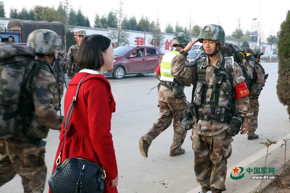 当军嫂黄薇从相关部门得知自己的丈夫任志刚所在部队将拉练经过云南省华宁县第一中学门口后,便在第二天驻足在校园门口等待自己的爱人,黄薇在行进的队伍里发现了任志刚,匆匆聊了两句,任志刚便与妻子告别,跑了两步又突然回头,给妻子敬了一个军礼。这是他们结婚后的第一次见面。(熊子军、马飞摄影报道)